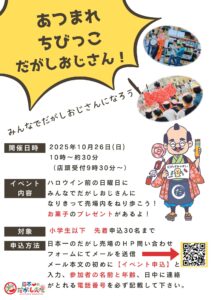 ハロウィン前の日曜日にみんなでだがしおじさんになりきって売場内をねり歩こう!お菓子とだがしおじさんなりきりセットのプレゼントがあるよ!