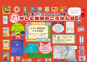 ゲームブースや飲食店ブースでの『だがしと笑顔交換』、だがしマンショー、だがし電車開放(クイズもあります★)とイベント盛りだくさん!